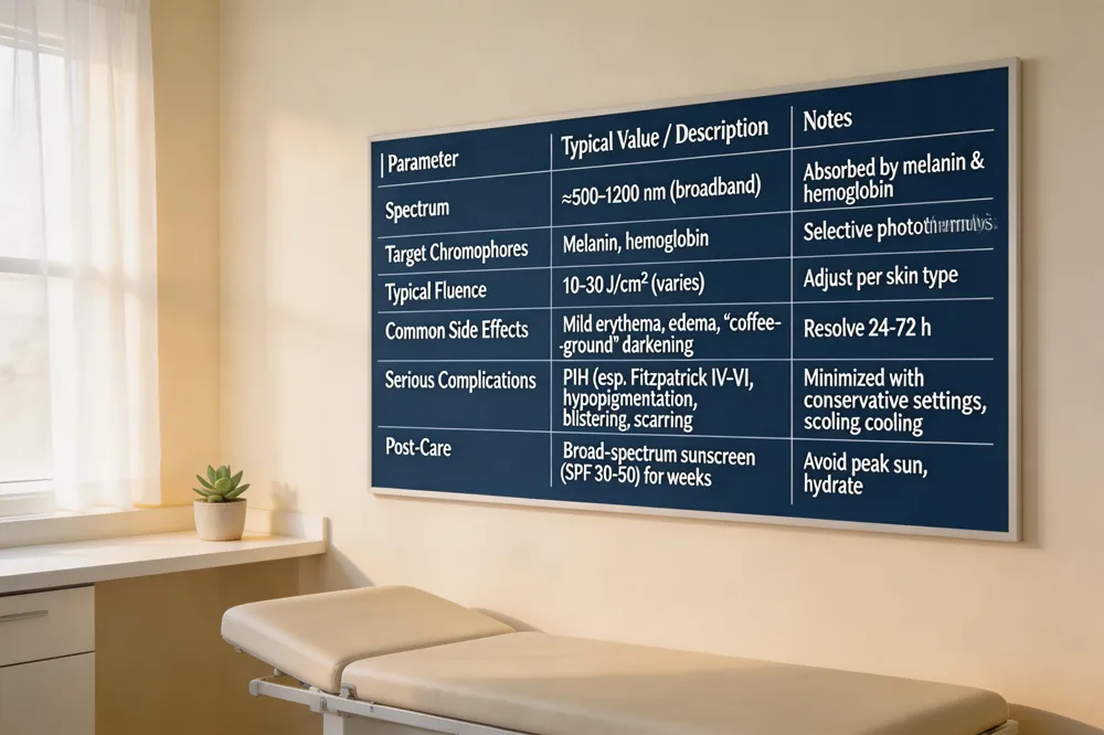 Intense Pulsed Light (IPL) emits a broadband spectrum (≈500‑1200 nm) that is absorbed by melanin and hemoglobin. Selective photothermolysis heats melanin granules, fragmenting pigment, and coagulates superficial vessels, leading to natural clearance and collagen remodeling. Typical side‑effects are mild erythema, edema, and a fleeting “coffee‑ground” darkening of treated spots (see coffee‑ground phase); these resolve within 24‑72 hours and require 1‑2 days of downtime. More significant complications can include post‑inflammatory hyperpigmentation (PIH), especially in Fitzpatrick IV‑VI skin, hypopigmentation, blistering, scarring, or prolonged pigment rebound if fluence is too high or cooling is insufficient. The skin becomes photosensitized, mandating strict broad‑spectrum sunscreen use for weeks after treatment. Proper patient selection, test spots, conservative settings, and diligent post‑care mitigate these risks and improve outcomes.