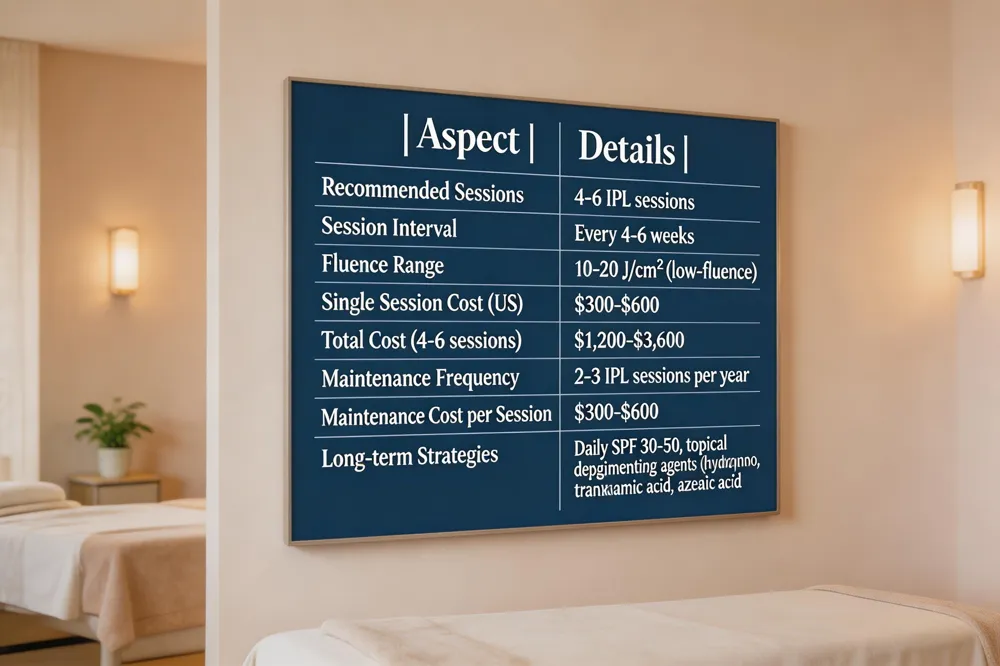 For melasma, clinicians typically recommend a series of 4–6 IPL sessions spaced every 4–6 weeks, using low‑fluence settings (10‑20 J/cm²) and cooling to minimize post‑inflammatory hyperpigmentation. The average price of a single facial IPL treatment in the United States ranges from $300 to $600, depending on geographic location, provider expertise, and the size of the treated area. After completing the initial course, sunspots and melasma can recur if UV exposure resumes; studies show that diligent daily broad‑spectrum sunscreen (SPF 30 – 50) and avoidance of peak sun hours are the most effective strategies to prevent new pigment formation. Long‑term maintenance typically involves 2–3 IPL sessions per year, combined with ongoing topical depigmenting agents (hydroquinone, tranexamic acid, azelaic acid) and strict photoprotection. This multimodal approach helps sustain results, reduces the risk of rebound hyperpigmentation, and supports overall skin health.