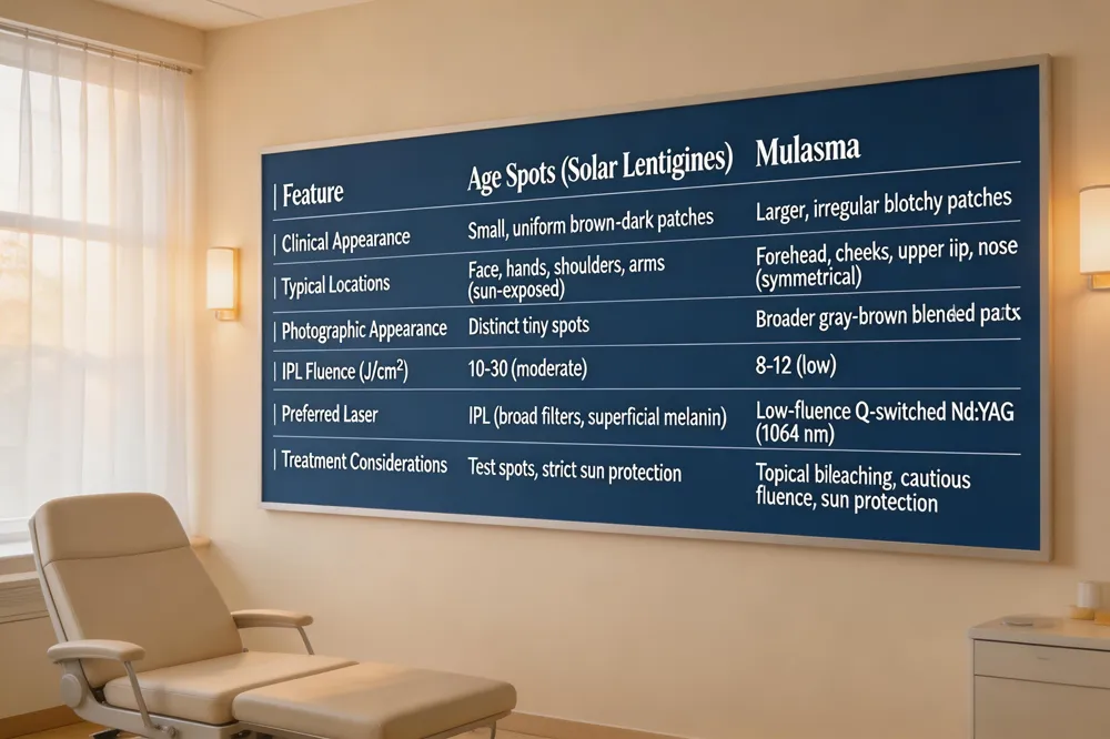 Age spots (solar lentigines) and melasma are both hyperpigmentation disorders, yet they differ markedly in clinical appearance, photographic patterns, and treatment considerations. Age spots appear as small, uniform, brown‑to‑dark patches that are usually isolated and found on chronically sun‑exposed areas such as the face, hands, shoulders, and the backs of the arms. In contrast, melasma presents as larger, irregularly shaped, blotchy patches that are often symmetrical and concentrated on the forehead, cheeks, upper lip, and sometimes the sides of the nose. Photographically, age spots look like distinct dots or tiny spots, while melasma looks like broader, often gray‑brown patches that blend into the surrounding skin. These visual differences guide therapeutic choices: age spots respond well to IPL with moderate fluence (10‑30 J/cm²) and broader filters that target superficial melanin, whereas melasma—especially deeper or mixed types—requires cautious, low‑fluence IPL (8‑12 J/cm²) or low‑energy Q‑switched Nd:YAG laser protocols, often combined with topical bleaching agents to minimize post‑inflammatory hyperpigmentation. Proper patient selection, test spots, and rigorous sun protection are essential for both conditions to achieve optimal outcomes.