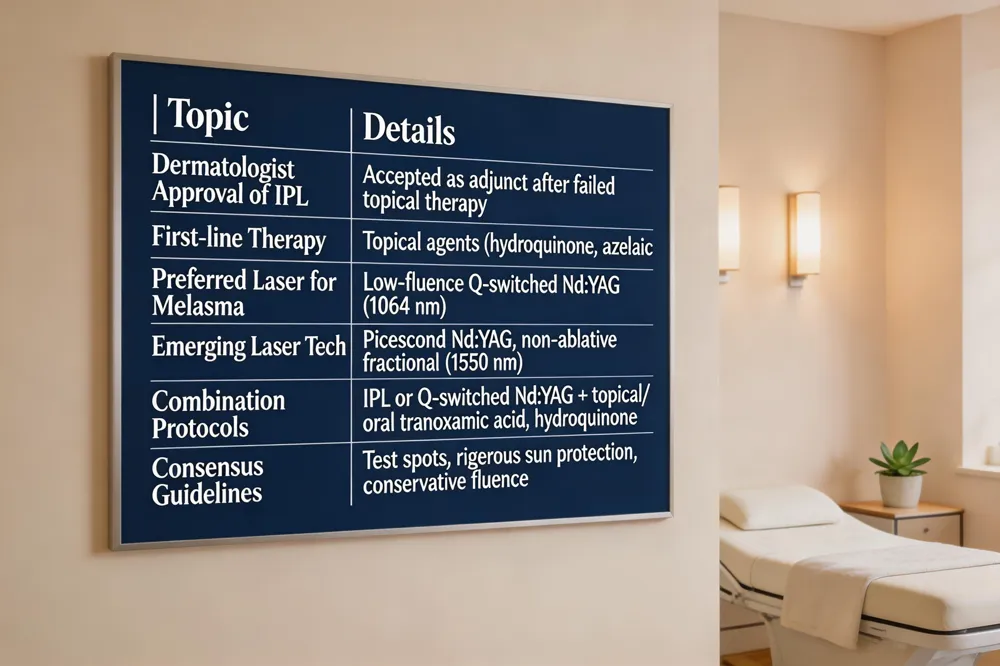 Board‑certified dermatologists acknowledge IPL’s versatility but reserve it for patients who have failed first‑line topical therapy. Consensus guidelines recommend IPL as an adjunct, not a primary, for melasma and stress rigorous pre‑treatment counseling, test spots, and sun protection to mitigate post‑inflammatory hyperpigmentation (PIH).