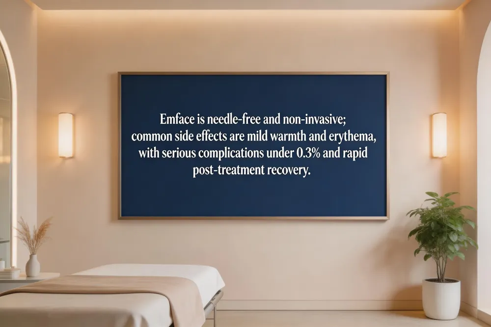 Emface is a needle‑free, non‑invasive facial rejuvenation system that delivers synchronized radiofrequency (RF) heat and high‑intensity focused electrical stimulation (HIFES™). Common short‑term adverse events are mild and transient: a warm sensation during treatment, slight erythema, and brief swelling or muscle fatigue that resolve within a few hours. Rarely, patients notice temporary bruising or mild puffiness, but serious complications occur in less than 0.3 % of cases. Long‑term safety is excellent; no lasting skin changes, nerve injury, or permanent pigment alteration have been reported when the procedure is performed by trained professionals and proper patient screening is applied.