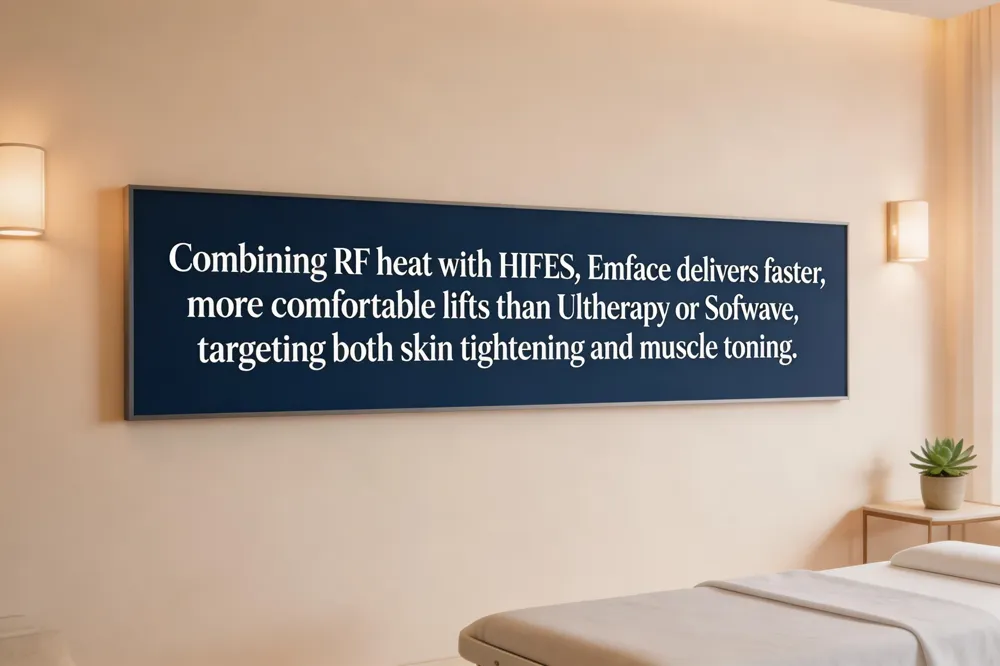 EMFACE distinguishes itself from other skin‑tightening technologies by pairing radio‑frequency (RF) heating with High‑Intensity Focused Electrical Stimulation (HIFES™). The RF component raises dermal temperature to 40‑45 °C, triggering collagen and elastin synthesis, while HIFES induces deep, voluntary‑like muscle contractions that lift and tone the face. In contrast, Ultherapy relies on micro‑focused ultrasound to target the SMAS layer, producing a slower, deeper lift that can last 1‑3 years but often feels more uncomfortable. Sofwave uses focused ultrasound at ~1.5 mm depth for collagen remodeling, excelling at brow and neck lift, yet it does not address muscle tone. Traditional RF tightening devices heat the skin alone, typically requiring more sessions to achieve comparable lift.