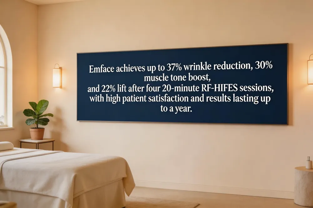 Emface delivers measurable gains in facial rejuvenation. Clinical data report a 37 % reduction in wrinkle depth, a 30 % increase in muscle tone, and a 22 % improvement in facial lift after a standard series of four 20‑minute RF‑HIFES sessions. Patients often notice a 27 % lift in facial contour within 30 days, with continued tightening for six to twelve weeks.